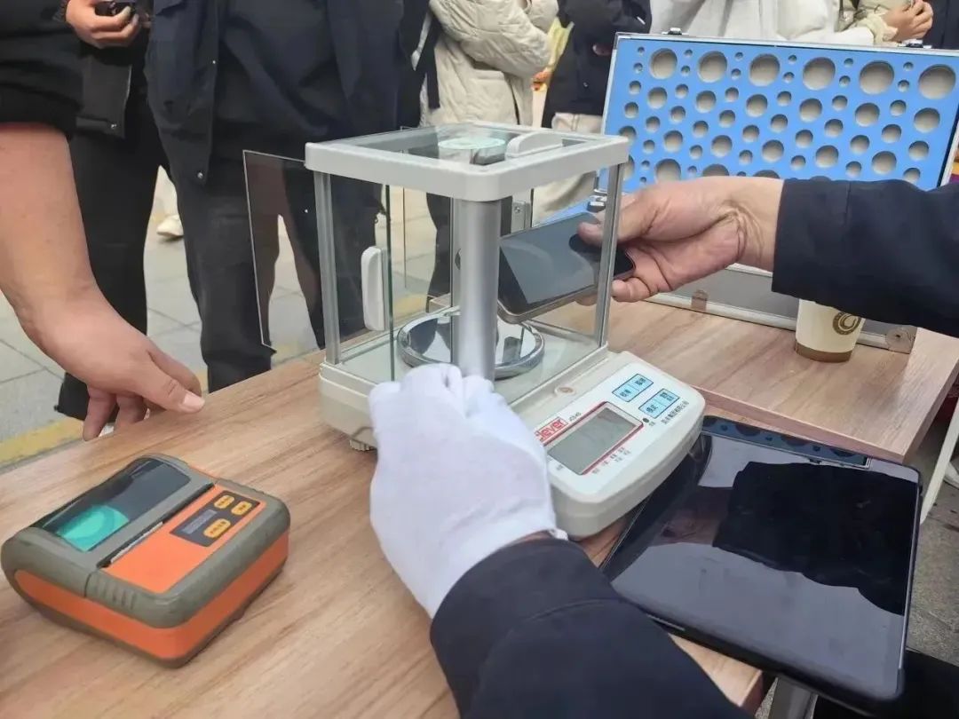 活動現(xiàn)場,計(jì)量檢定工作人員使用檢定合格的電子天平對師生攜帶的手機(jī)進(jìn)行稱重,加貼統(tǒng)一制式的重量標(biāo)簽,手機(jī)秒變“砝碼”,可以快速、準(zhǔn)確地辨識電子計(jì)價(jià)秤的準(zhǔn)確性。在遇到商家使用電子計(jì)價(jià)秤稱量商品時,只需將加貼重量標(biāo)簽的手機(jī)直接放在電子秤上當(dāng)場測試,就可以初步判斷是否遭遇了缺斤少兩的“黑心秤”。本次手機(jī)變砝碼活動深受師生好評,共為200余名師生的手機(jī)進(jìn)行計(jì)量稱重,并張貼“手機(jī)砝碼”標(biāo)識。