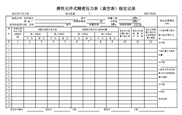 彈性元件式精密壓力表(真空表)檢定記錄資料下載 此文件為會員下載(點擊注冊下載)