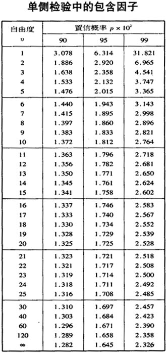 單側(cè)檢驗與雙側(cè)檢驗在合成標(biāo)準(zhǔn)不確定度評定中的方法相同,只是給出擴展不確定度(p=95%)所乘的包含因子k95,與雙側(cè)檢驗不同,即不是查本講座6.6中的t值表而是下表: