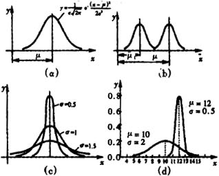 圖中示出了總體均值為μ,總體標準〔偏〕差為σ的正態(tài)分布的情形。由圖(c)可見,σ愈小,分布曲線愈集中或愈尖銳,表征測量結(jié)果或觀測值的分散性愈??;反之σ愈大,曲線愈平坦,表征分散性愈大。由圖(a)可見,分布曲線在x=μ處具有極大值,曲線不僅是單峰的,而且對x=μ直線來說是對稱的,在x=μ±σ處有兩個拐點。由圖(b)可見,分布的中心在x-μ處,μ值的大小決定了曲線在x軸上的位置,圖(d)對兩條不同μ值和不同σ值的正態(tài)分布曲線進行了比較。
