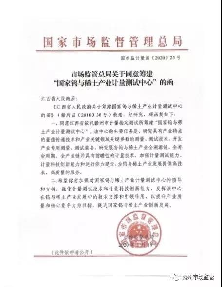 1月19日,國家市場監(jiān)管總局致函江西省人民政府,同意江西省依托贛州市計量檢定測試所籌建“國家鎢與稀土產(chǎn)業(yè)計量測試中心”,這是江西省首家獲批籌建的國家級產(chǎn)業(yè)計量測試中心,對推動贛州建設(shè)發(fā)展稀土鎢新型功能材料戰(zhàn)略性新興產(chǎn)業(yè)集群,打通實驗室到產(chǎn)品生產(chǎn)的“最后一公里”具有重要意義。