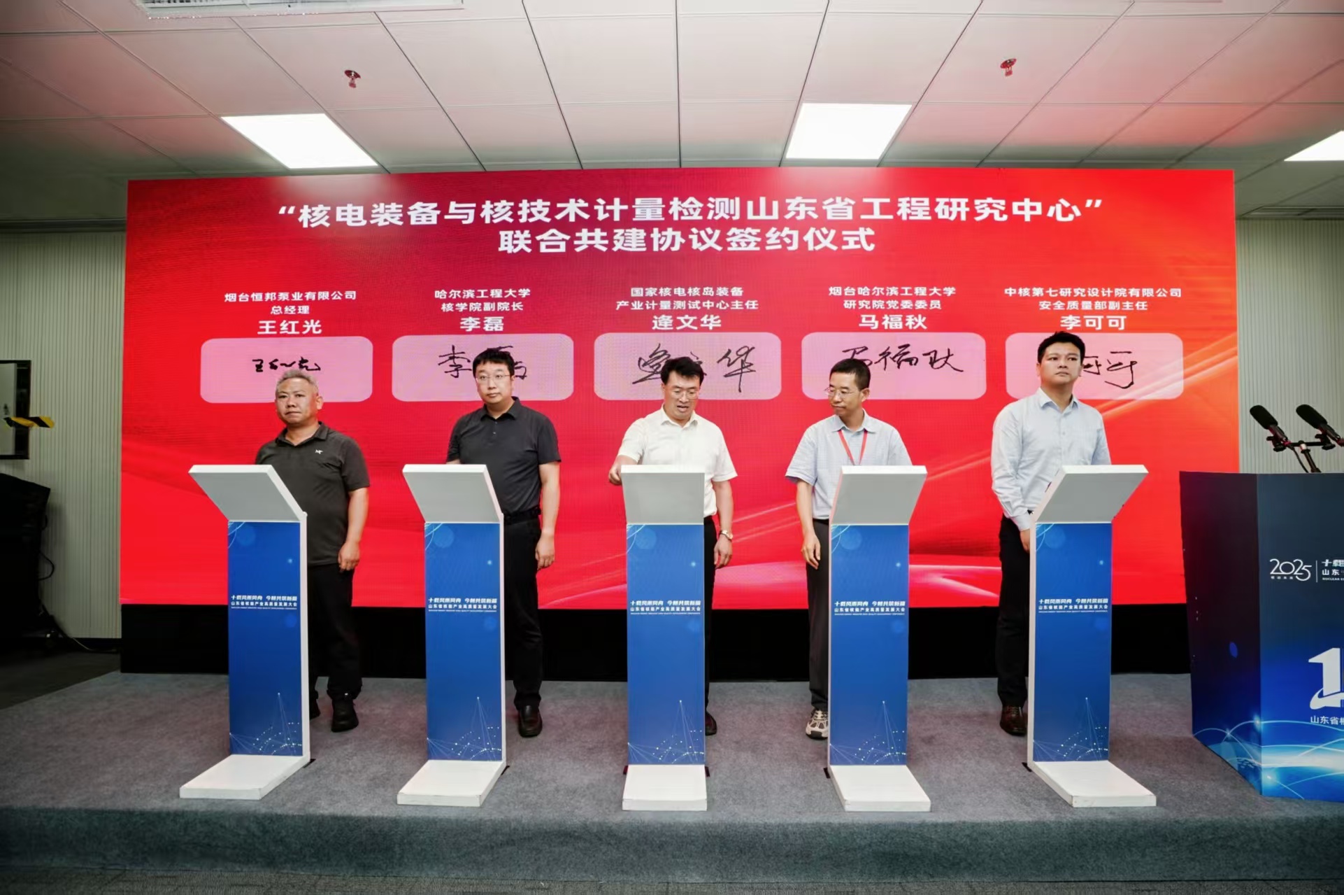 在合作簽約環(huán)節(jié),國家核電核島裝備產(chǎn)業(yè)計量測試中心主任逄文華、中核第七研究設計院有限公司安全質量部副主任李可可、哈爾濱工程大學核學院副院長李磊、煙臺哈爾濱工程大學研究院黨委委員馬福秋教授、煙臺恒邦泵業(yè)有限公司總經(jīng)理王紅光共同簽署“核電裝備與核技術計量檢測山東省工程研究中心”聯(lián)合共建協(xié)議。此次聯(lián)合共建,匯聚了科研機構、高校、企業(yè)等多方力量,將實現(xiàn)資源共享、優(yōu)勢互補,加速核電裝備與核技術計量檢測領域的技術突破與產(chǎn)業(yè)應用,為工程研究中心的長遠發(fā)展提供有力保障。