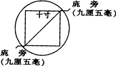 答:每邊10寸的正方形,其對角線長:△=14.142135寸,加庣旁九厘五毫(0.095寸),銅斛底圓的直徑為:14.142135+2×0.095=14.3321356寸,半徑為7.1660678;可求得劉歆的圓周率:π=162÷(7.166)2=3.1547。