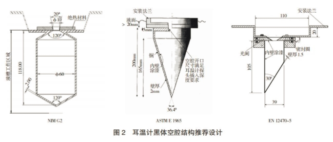 耳溫計(jì)黑體空腔是檢定裝置的關(guān)鍵組件,在JJG1164-2019 附錄 A 中給出了標(biāo)準(zhǔn)耳溫計(jì)黑體空腔(型號 NIM G2)結(jié)構(gòu)、尺寸和明確的制作工藝要求。黑體空腔(8 ~ 14)μm 波長范圍發(fā)射率應(yīng)不低于0.999,開口直徑為(8 ~ 10)mm。美國標(biāo)準(zhǔn) ASTM E1965-98(2016)《間歇測定病人體溫用紅外溫度計(jì)標(biāo)準(zhǔn)規(guī) 范》(Standard Specification for Infrared Thermometers for Intermittent Determination of Patient Temperature) 和歐洲標(biāo)準(zhǔn) EN 12470-5 Final (E) 2003《醫(yī)用溫度計(jì) - 第 5 部分:紅外耳溫計(jì)性能要求 》(Clinical thermometer-part 5:Performance of infra-red ear thermometers with maximum device) 也發(fā)布了耳溫計(jì)黑體空腔的結(jié)構(gòu)尺寸及工藝要求,如圖 2 所示,這兩款耳溫計(jì)空腔在我國耳溫計(jì)生產(chǎn)企業(yè)和計(jì)量技術(shù)機(jī)構(gòu)都有應(yīng)用。受空腔發(fā)射率直接測量水平不理想的限制,規(guī)程制定中采用亮度溫度比對實(shí)驗(yàn)確定 NIM G2 空腔與和 ASTM 和 EN 標(biāo)準(zhǔn)推薦的空腔三者間的差異,用以驗(yàn)證 NIM G2 空腔技術(shù)要求的合理性。試驗(yàn)數(shù)據(jù)表明,采用 ASTM 空腔和NIM G2 空腔復(fù)現(xiàn)的亮度溫度沒有差異。與 ASTM 空腔相比,NIM G2 空腔的尺寸小,空腔底部圓錐頂角角度(120°)相對于 ASTM 空腔的 36.4°更容易加工,材料成本低和加工難度小是 NIM G2 空腔的優(yōu)點(diǎn)。EN 空腔復(fù)現(xiàn)亮度溫度比 NIM G2 低 0.01℃。雖然0.01℃在數(shù)值上與亮溫比較器的顯示分辨力相當(dāng), 但結(jié)合比對實(shí)驗(yàn)的重復(fù)性考慮,EN 空腔發(fā)射率偏低概率比較高,建議謹(jǐn)慎采用 EN 空腔設(shè)計(jì)。在計(jì)量標(biāo)準(zhǔn)考核中,可采用裝置亮溫比較方法驗(yàn)證裝置復(fù)現(xiàn)量值能力,建議在計(jì)量標(biāo)準(zhǔn)復(fù)查考核周期中間開展一次亮溫比對能力驗(yàn)證。