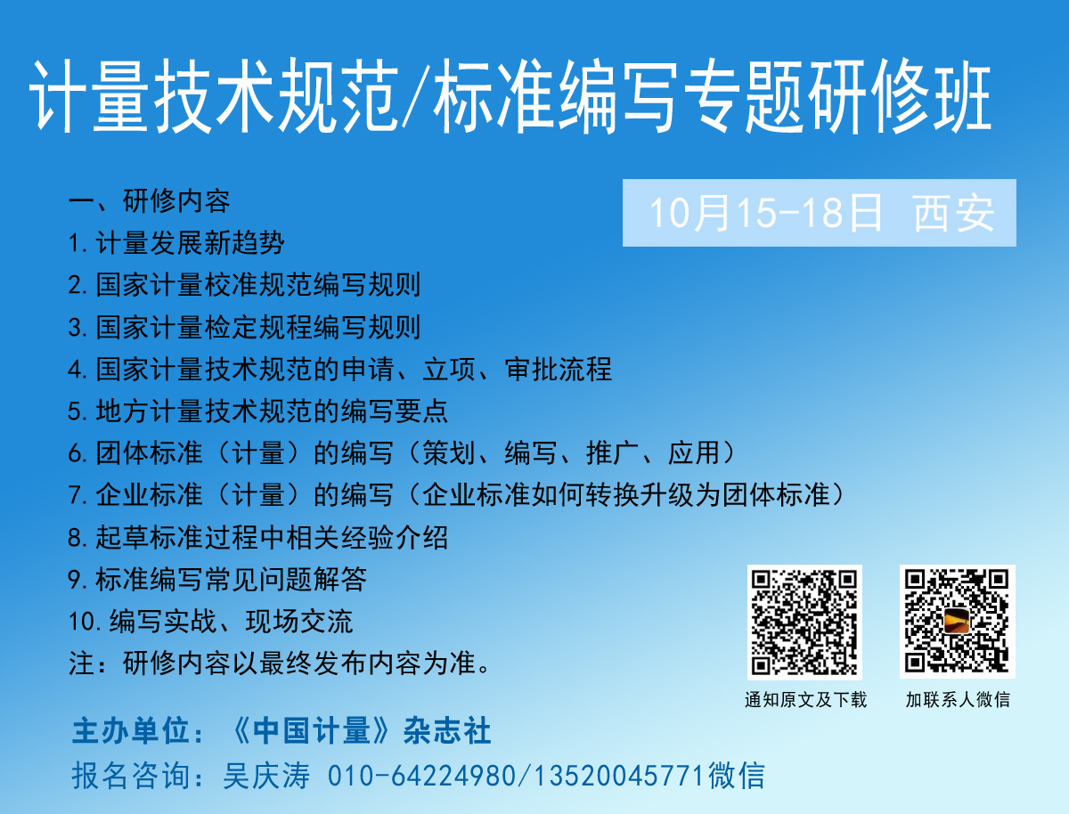 為貫徹落實《計量發(fā)展規(guī)劃2021-2035年》、《國家標(biāo)準(zhǔn)化發(fā)展綱要》相關(guān)要求,加強計量基礎(chǔ)能力建設(shè),夯實新產(chǎn)業(yè)、新技術(shù)、新業(yè)態(tài)創(chuàng)新發(fā)展的計量技術(shù)基礎(chǔ)設(shè)施,有效提升計量技術(shù)規(guī)范/標(biāo)準(zhǔn)制修訂水平,推動計量技術(shù)規(guī)范和團體標(biāo)準(zhǔn)建設(shè)(計量),為技術(shù)產(chǎn)業(yè)融合發(fā)展提供穩(wěn)定高效的計量技術(shù)服務(wù),助推新質(zhì)生產(chǎn)力加快形成?!吨袊嬃俊冯s志社將于2024年10月15日至18日在西安市舉辦“計量技術(shù)規(guī)范/標(biāo)準(zhǔn)編寫專題研修班”,以幫助計量相關(guān)技術(shù)規(guī)范/標(biāo)準(zhǔn)編寫人員解決實際工作中的問題,提高計量人員的編寫能力。本培訓(xùn)班自愿參加,歡迎各單位積極報名,通知如下: