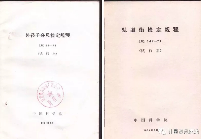 1958年以后一段時間,國家計量局一直由國家科委領導,文化大革命期間國家科委和中國科學院合并成立了新的中國科學院,國家計量局和中國計量科學研究院都歸為中國科學院領導。中國科學院于1970年4月至10月,邀請北京地區(qū)工礦企業(yè)等有關部門組成檢定規(guī)程修訂小組,選擇了使用比較普遍的千分尺等七種檢定規(guī)程進行修訂,并以中國科學院的名義頒布實施。到目前為止,發(fā)現(xiàn)的最早采用“JJG”編號方法的檢定規(guī)程,是外徑千分尺檢定規(guī)程編號為:JJG21-71,外包皮為白色,尺寸為(20.9×14.8)cm。