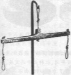 這架天平還明顯保留著原始天平的缺陷:通過橫梁上鉆的空洞吊起繩子作為支點(diǎn),其等臂性很難保證,加之繩子的摩擦力較大,導(dǎo)致天平的靈敏度極低,稱重的精確度受到很大限制。這種天平的準(zhǔn)確度大概只有1%,甚至更差一些。