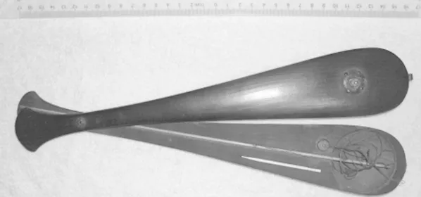在我多年的收藏中就有幾桿這樣的線戥:盒為紅木質(zhì)地,桿為骨質(zhì)。以其中之一為例:桿長度達到31.7厘米,重量為2.27克,用游標卡尺測量桿的直徑,大處只有2.25毫米,小處只有1.3毫米,非常纖細,比普通牙簽略大(見下圖);上面是兩行刻度,頭紐稱量范圍是1錢至1兩,二紐稱量范圍是0至1錢。盤為厚0.25毫米的黃銅質(zhì),直徑5厘米,重5.1克。砣是一個直徑0.94厘米、高0.83厘米的小圓柱體,經(jīng)檢測重量為4.55克,折合清代計量標準為1錢2分,為非定量砣。盒的銅扣件采取了非常巧妙的暗推倒鉤結(jié)構(gòu),設(shè)計十分完美實用,以至于在數(shù)百年后的今天還能輕松開啟。