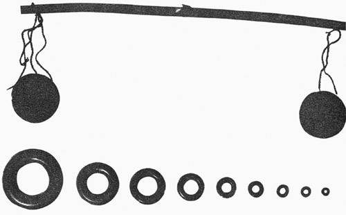 春秋時(shí)期,楚國(guó)制造有小型衡器——木衡、銅環(huán)權(quán),用來(lái)稱黃金貨幣。完整的一套環(huán)權(quán)共十枚,分別為一銖、二銖、三銖、六銖、十二銖、一兩、二兩、四兩、八兩、一斤。一銖重0.69克,一兩重15.5克,一斤251.3克,十枚相加約500克,為楚制二斤。中國(guó)歷史博物館藏有一支戰(zhàn)國(guó)時(shí)銅衡桿,正中間有提紐和穿線孔,一面顯出貫通上下的十等分刻線。