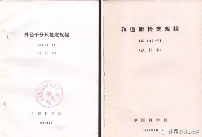 1958年以后一段時(shí)間,國家計(jì)量局一直由國家科委領(lǐng)導(dǎo),文化大革命期間國家科委和中國科學(xué)院合并成立了新的中國科學(xué)院,國家計(jì)量局和中國計(jì)量科學(xué)研究院都?xì)w為中國科學(xué)院領(lǐng)導(dǎo)。中國科學(xué)院于1970年4月至10月,邀請北京地區(qū)工礦企業(yè)等有關(guān)部門組成檢定規(guī)程修訂小組,選擇了使用比較普遍的千分尺等七種檢定規(guī)程進(jìn)行修訂,并以中國科學(xué)院的名義頒布實(shí)施。到目前為止,發(fā)現(xiàn)的最早采用“JJG”編號方法的檢定規(guī)程,是外徑千分尺檢定規(guī)程編號為:JJG21-71,外包皮為白色,尺寸為(20.9×14.8)cm。