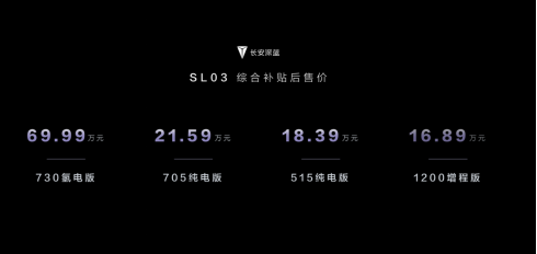 作為新品牌的開篇之作,長安深藍SL03搭載多項全球首發(fā)及行業(yè)率先量產(chǎn)的技術(shù),實現(xiàn)了在智能、續(xù)航、三電領(lǐng)域的三大超級突破。在本次上市發(fā)布會上,共推出純電版、增程版、氫電版三種能源形式、4款配置版本的車型,并將提供包含啞光車漆、多種內(nèi)飾CMF、運動輪轂、高階智能駕駛輔助服務(wù)等個性化選裝來滿足用戶的多樣化需求,新車的官方指導(dǎo)價16.89-69.99萬元。