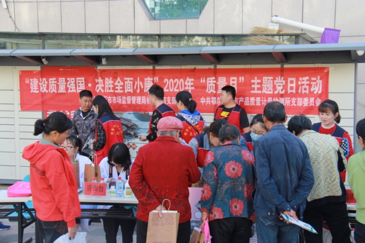 二是開(kāi)展相關(guān)主題黨日活動(dòng)。9月24日,市質(zhì)計(jì)所黨支部帶領(lǐng)黨員同志和專業(yè)技術(shù)人員到康巴什珠江社區(qū)開(kāi)展“建設(shè)質(zhì)量強(qiáng)國(guó) 決勝全面小康”2020年“質(zhì)量月”主題黨日活動(dòng)。活動(dòng)設(shè)立了咨詢臺(tái)、眼鏡檢測(cè)臺(tái)、血壓計(jì)檢測(cè)臺(tái)、人體秤檢測(cè)臺(tái)等,為居民開(kāi)展了檢驗(yàn)檢測(cè)現(xiàn)場(chǎng)服務(wù)和咨詢,并發(fā)放了民用計(jì)量器具知識(shí)、計(jì)量保障質(zhì)量知識(shí)宣傳冊(cè)和小紀(jì)念品共計(jì)300余份,營(yíng)造了追求質(zhì)量、關(guān)注質(zhì)量的良好氛圍。