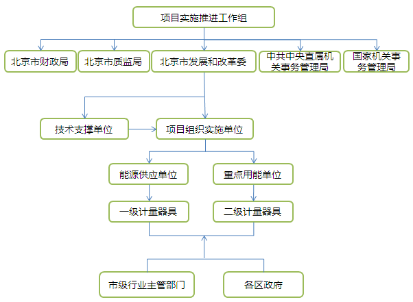北京市的能源基礎能力建設工作涉及單位眾多,各層級單位分工明確,為項目順利奠定基礎。該項目由市發(fā)展改革委、市質監(jiān)局、市財政局牽頭,中共中央直屬機關事務管理局、國家機關事務管理局公共機構節(jié)能管理司共同推動,市級行業(yè)主管部門分類指導,各區(qū)政府分頭推進,項目組織實施單位負責組織落實,能源供應單位和重點用能單位具體實施。北京市電力公司、北京市燃氣集團有限責任公司、北京市自來水集團、北京市熱力集團有限責任公司等能源供應單位,負責實施重點用能單位相應能源品種的一級計量器具配置項目,各重點用能單位配合開展本單位電、氣、水、熱的一級計量器具配置,并負責實施本單位電、氣、熱、水的二級計量器具配置工作。能源計量建設組織架構如圖4所示。