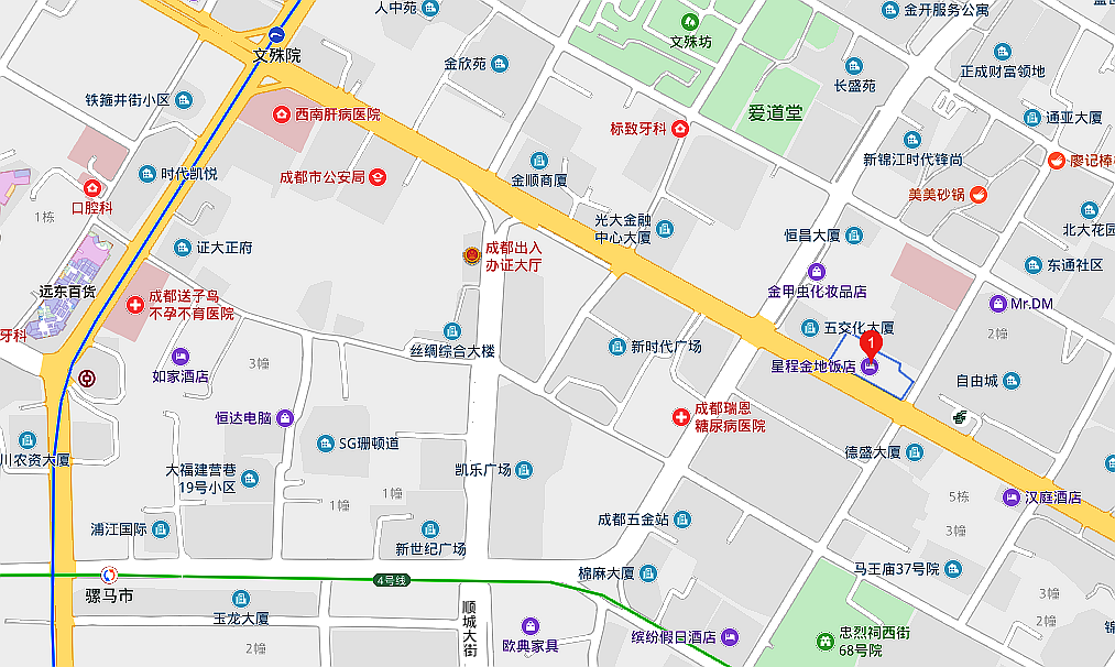 乘坐地鐵1號線途徑2站到達(dá)文殊院站(H和K出口),步行1100米左右即到;