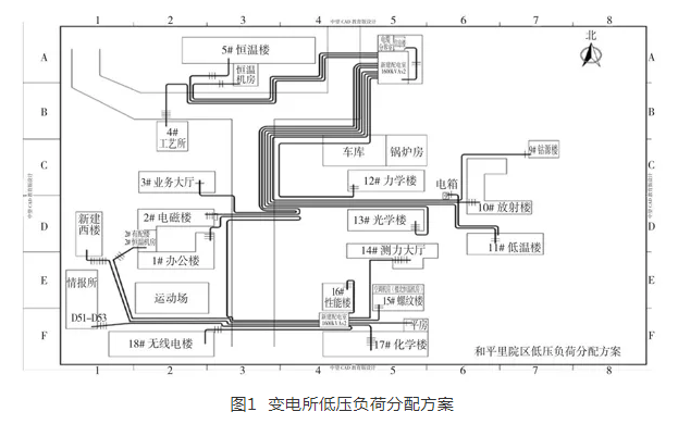 根據(jù)《供配電系統(tǒng)設(shè)計(jì)規(guī)范》等相關(guān)標(biāo)準(zhǔn)中,變電所選址宜接近負(fù)荷中心、接近電源側(cè)和方便運(yùn)輸?shù)纫?,結(jié)合中國(guó)計(jì)量院和平里院區(qū)實(shí)驗(yàn)樓分布特點(diǎn),變電所采用總降壓變電所和分降壓變電所相結(jié)合的方式設(shè)置。總變電所位于院區(qū)北側(cè),負(fù)責(zé)院北區(qū)實(shí)驗(yàn)室及辦公樓供電,設(shè)置1600kVA干式變壓器兩臺(tái),預(yù)留遠(yuǎn)期安裝位置兩臺(tái);分變電所位于院南區(qū)負(fù)荷中心,承擔(dān)南區(qū)實(shí)驗(yàn)樓供電,設(shè)置1600kVA干式變壓器兩臺(tái)(低壓負(fù)荷分配方案如圖1所示)。