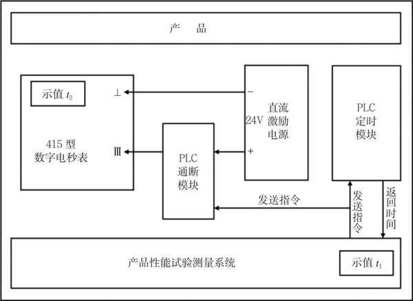 選用成都鐘表廠生產的415型數(shù)字電秒表,最大允許誤差為±(5×10-5Rd+時基),時基選擇0.001s,模式置“連續(xù)”;以及相應的1214C型PLC通斷模塊,測量分辨力為0.001s,通斷模塊初始狀態(tài)設為斷開,串入激勵電源正電壓通路,校準方法示意圖如圖2所示。