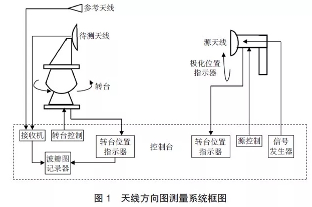 圖1給出了典型的在微波暗室內(nèi)進(jìn)行天線方向圖測量的系統(tǒng)框圖,涉及的主要儀器有天線測試轉(zhuǎn)臺、射頻信號源、場強計及參考天線等。