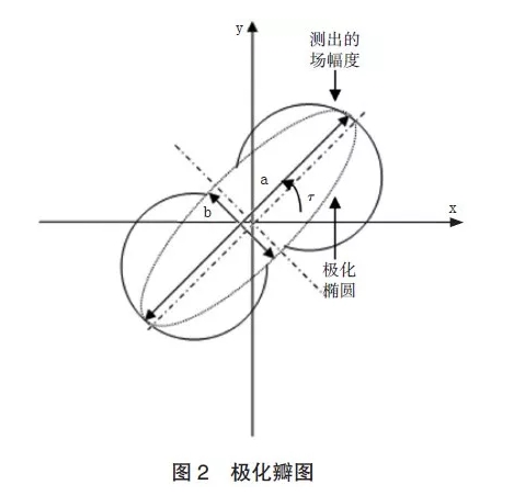 線極化天線的極化純度測量指標(biāo)決定交叉極化分量與主極化分量的相對大小,測量中一般使用極化純度很高的振子天線作為發(fā)射天線或接收天線來完成。圓極化天線極化特性測量包括軸比AR測量、極化傾角τ測量、玄向測量和極化方向圖測量。軸比、傾角可以通過旋轉(zhuǎn)線極化天線極化角度,然后從待測天線接收到的功率計算出來,還可以根據(jù)測量結(jié)果作出極化瓣圖,如圖2所示。極化旋向一般使用兩副極化旋向相反的天線與待測天線分別配對,待測天線極化旋向與輸出較大的那副天線相同。如果將線極化天線快速旋轉(zhuǎn),同時緩慢變化待測圓極化天線的方位角,即可測出極化方向圖。