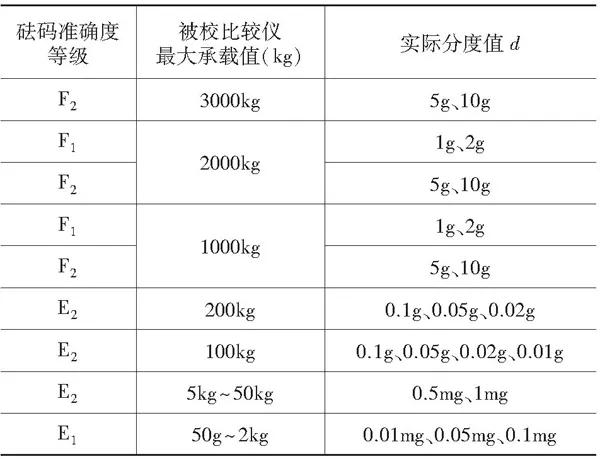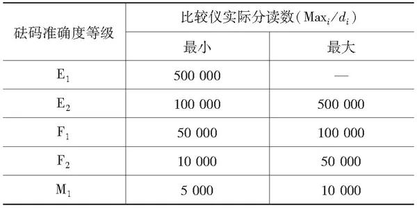 表1 砝碼準(zhǔn)確度等級(jí)與比較儀實(shí)際分讀數(shù)關(guān)系表
