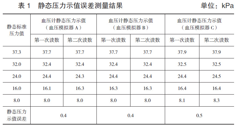使用該型號電子血壓計的靜態(tài)壓力測量專用接頭,用膠管和三通把電子血壓計與金屬容器、標(biāo)準(zhǔn)器連接起來組成檢定系統(tǒng)。將電子血壓計調(diào)至靜態(tài)壓力測試模式,在電子血壓計規(guī)定的靜態(tài)壓力范圍內(nèi),標(biāo)準(zhǔn)器設(shè)定5個檢定點(diǎn),由標(biāo)準(zhǔn)器對電子血壓計逐點(diǎn)從高到低降壓,重復(fù)進(jìn)行2次壓力測量,測量結(jié)果如表1所示。