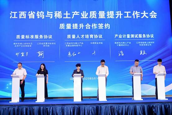 會(huì)上,國家鎢與稀土產(chǎn)業(yè)計(jì)量測試中心聯(lián)合國家鎢與稀土產(chǎn)品質(zhì)檢中心等單位與江西省質(zhì)量和標(biāo)準(zhǔn)化研究院、江西粵磁稀土新材料科技有限公司、和君職業(yè)學(xué)院就質(zhì)量標(biāo)準(zhǔn)服務(wù)、產(chǎn)業(yè)計(jì)量測試服務(wù)、質(zhì)量人才培育簽訂“戰(zhàn)略合作協(xié)議”,攜手鎢與稀土產(chǎn)業(yè)共同邁向質(zhì)量提升和高質(zhì)量發(fā)展新征程。