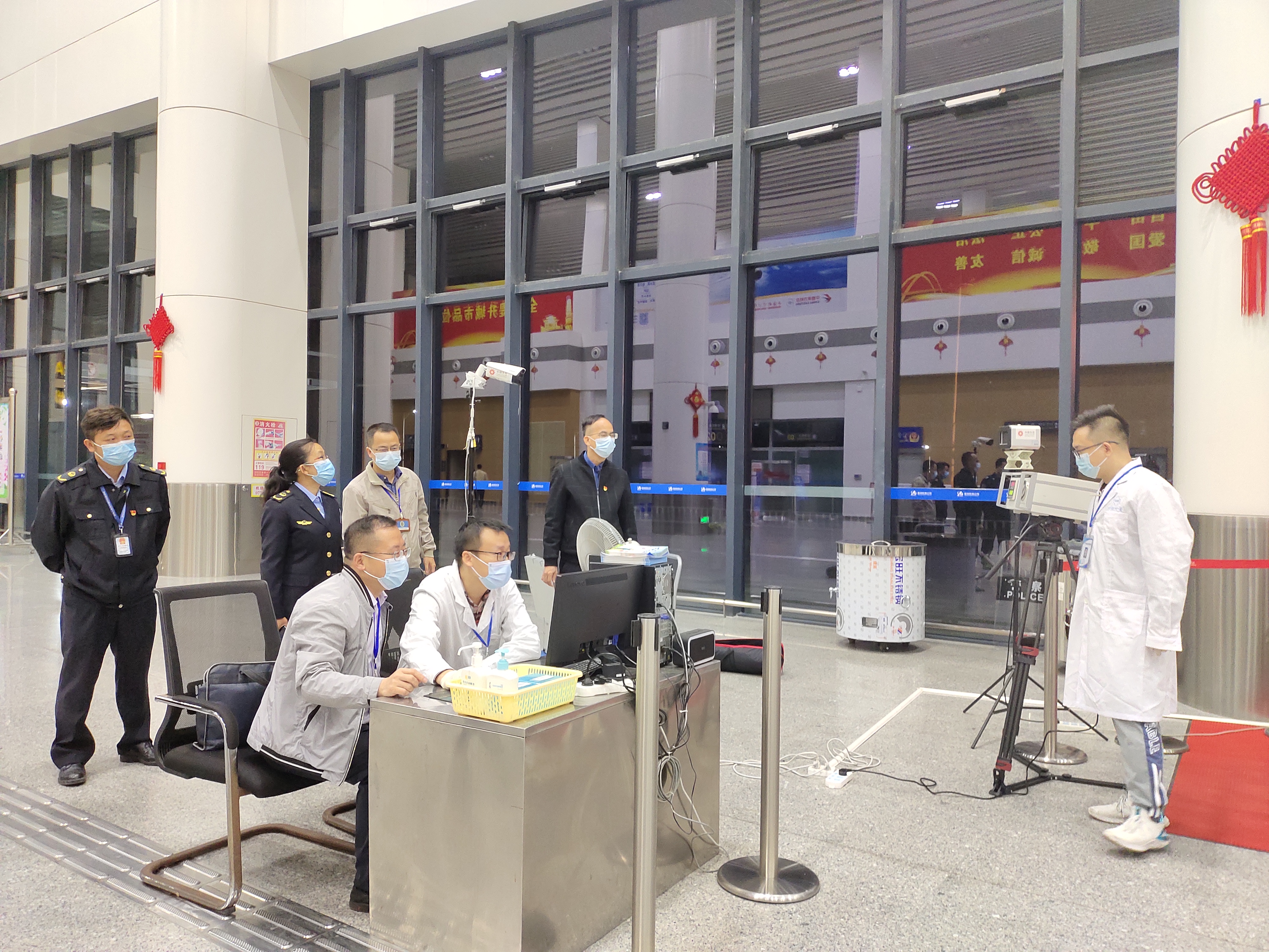 技術(shù)專家在梧州機(jī)場(chǎng)檢測(cè)紅外線測(cè)溫儀