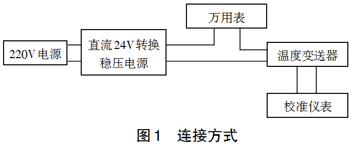 校準(zhǔn)主要是采用特殊的校準(zhǔn)儀器,連接溫度變送器,在現(xiàn)場進(jìn)行校驗。在校零點時,通過校準(zhǔn)儀器輸入0℃和最大值(如1300℃),看溫度顯示是否與標(biāo)準(zhǔn)給定的度數(shù)相一致,通過變送器模塊上的調(diào)零、調(diào)滿旋鈕調(diào)至與給定的數(shù)值一致。對于一體化的熱電偶,由于除了中控室顯示轉(zhuǎn)換的溫度,我們在現(xiàn)場看不到數(shù)值,所以采用另外一種校驗方法。主要用到的儀器有直流24V轉(zhuǎn)換穩(wěn)壓電源、萬用表、特殊的校準(zhǔn)儀器和一支一體化的熱電偶。連接方式如圖1所示。